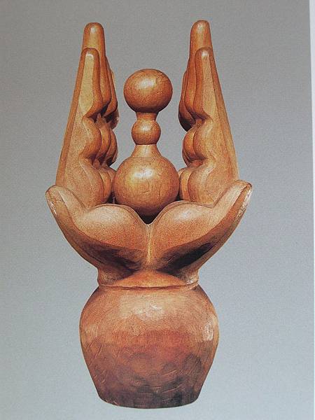 木雕是河井寬次郎在晚年非常喜愛的表現形式,在呈現上以手、人物、動物、臉為主題,在手的造型表現上受到佛教的宗教儀式的影響是明顯可見的,在作品中手的姿勢表現可以在佛像的造型裡探尋到根源,似乎在造型的過程中充滿了將手神聖化的意圖。羅丹曾形塑自己的一隻手,整件作品散發豐富的表情,其表現形式是如同紀念碑般的呈現,是否意味著創作者相同情愫。
