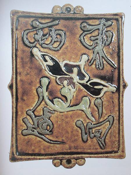 河井寬次郎的陶藝創作在實用容器的製作領域外還有陶塑的雕像、陶板壁飾、陶硯等的不同形式,陶板的創作是二次大戰後才開始(約1947年),河井寬次郎對人生及藝術的思考直接在陶板上以文字刻畫來表現,多以四字呈現如「獨坐萬行」、「手讀足解」、「東向西進」等,有種反省和警示的作用,這種當頭棒喝的精神,真令人由衷佩服。